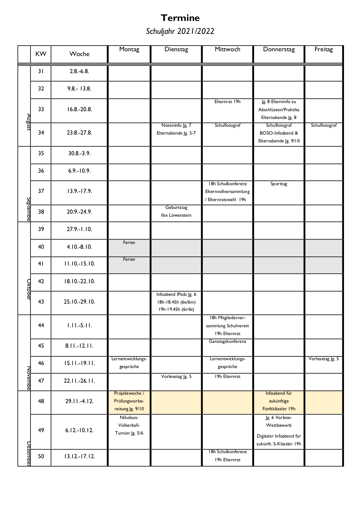 Terminkalender der Schule